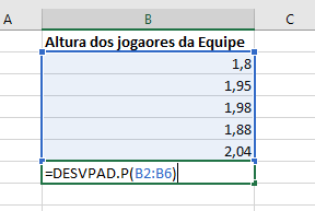 Para insertar cualquier fórmula en Excel, primero hay que poner el signo de igualdad «=». Luego debe escribir la función DESVPAD.P y así, seleccionar el rango donde se encuentran los argumentos de la función, como en la imagen siguiente.
